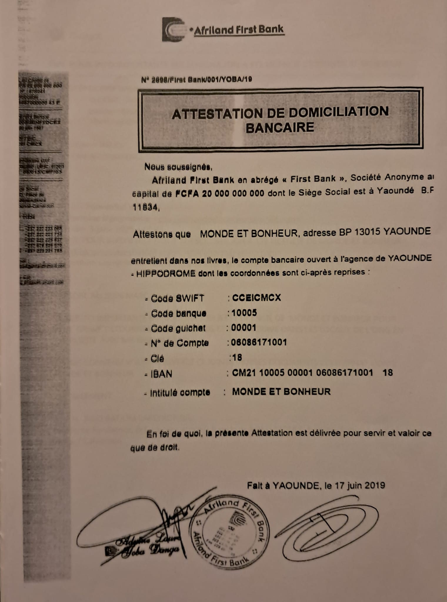 Afriland First Bank - Attestation de Domiciliation Bancaire