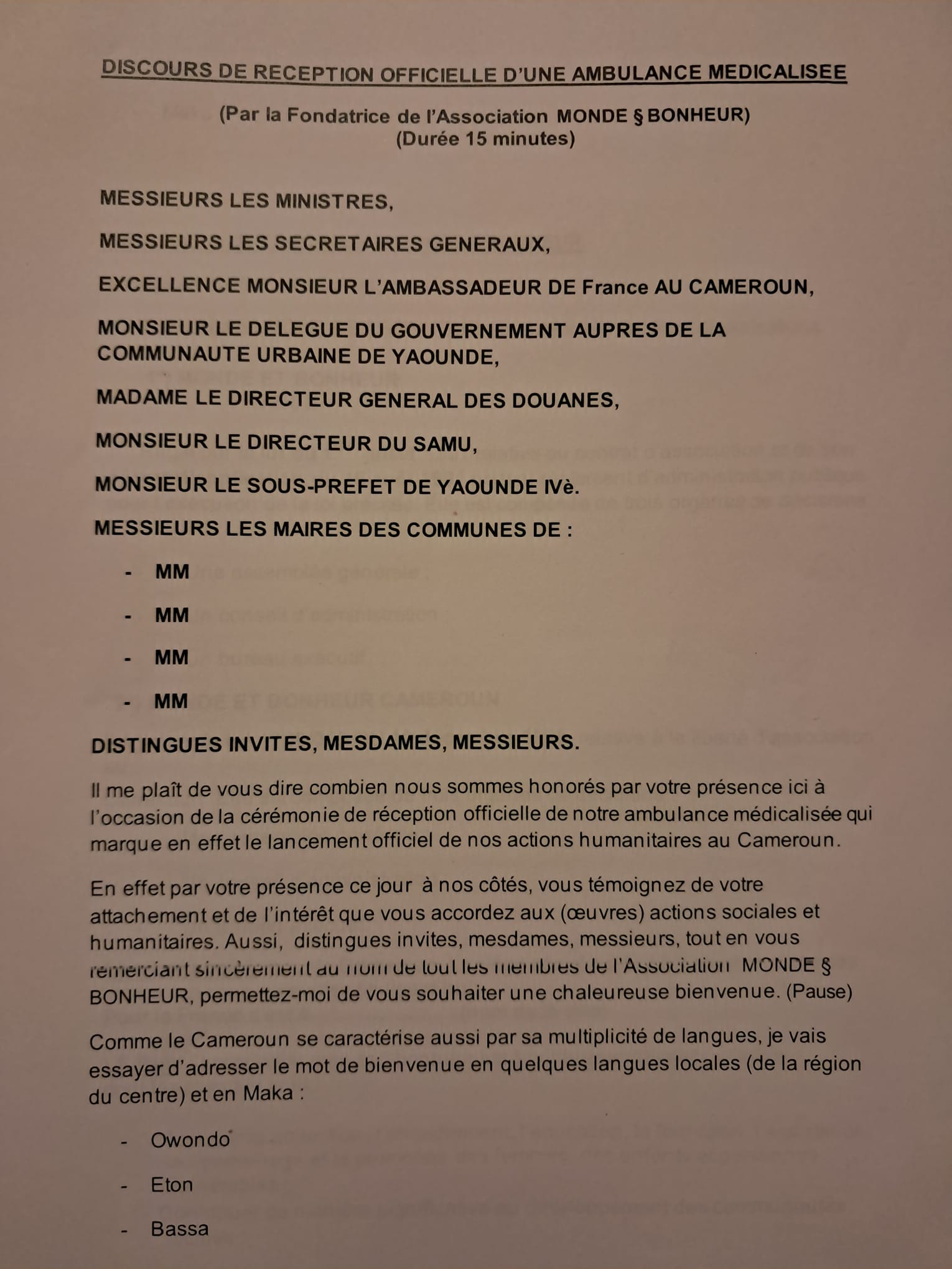 Discours de Reception officielle d'une AMbulance Medicalisee